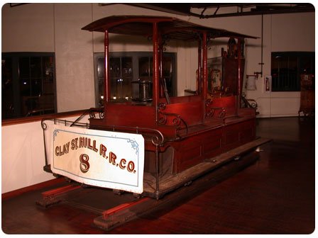 Many cable car lines followed the success of the Clay Street Hill Railroad, and by the 1880s cable cars were the mode of transportation in many cities around the United States and the world. The Clay Street Hill Railroad, while a great success financially and publicly, was sold to the newer Ferries and Cliff House Railway in 1887, giving that franchise a route to the Ferry Building at the foot of Market Street. In 1891 a portion of the Clay Street Hill Railroad tracks were removed and the line was reduced to being a half-mile shuttle between Powell Street and Van Ness Avenue, and then later incorporated into the company's Sacramento-Clay line. These older style dummy and trailer cars were phased out and put into storage. In 1893, Car #8, along with trailer #1, began its first leg of what would be the longest trip of its life. Car #8 traveled to Chicago, Illinois to be featured in the railroad display at the White City's stupendous World's Fair. As property of the Baltimore and Ohio Railroad, it was part of an exhibition being held in Baltimore in 1905. Thus, #8 survived the San Francisco Fire and Earthquake of 1906 that destroyed much of the cable car stock in the City, as well as many of the lines, and also survived a fire in Baltimore in 1907. Records of its career however were not so fortunate and appear to have been lost through those two disasters. Still, the little car was intact, though a long way from home. Clay Street Hill Railroad Car #8 finally returned home in 1939, under the ownership of the Railway & Locomotive Historical Society Inc., Pacific Coast Chapter. Who had possession of the car immediately prior to that is questionable. The B & 0 Magazine of January, 1941 stated that the car was presented to the Pacific Coast Chapter by the B & 0 Historical Collection, while Pacific Coast Chapter records from 1970 list it as donated from a Baltimore Junk Dealer! However it left Baltimore, the car was displayed in America: Cavalcade of Nations at the 1939 Golden Gate Exposition on Treasure Island. It remained a prominent feature of that Fair from 1939-40, along with another veteran of early cable car days in San Francisco, the Sutter Street Cable Railway Dummy #46 and Trailer #54, which have also found a home at the Cable Car Museum at Washington and Mason Streets. For a cable car whose original route ran somewhat less than a mile, #8 has traveled far and wide as an ambassador of San Francisco's past. Criss-crossing the country as well as the City, #8 has fortuitously survived far beyond its compatriots of the old City. It is a unique treasure and a priceless artifact of cable car lore and San Francisco's first franchise.