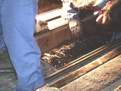 Muni maintenance crew inspecting frayed cable