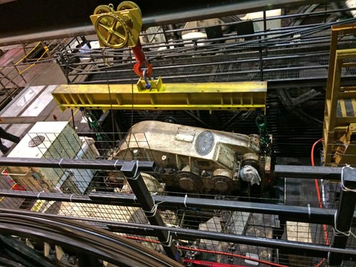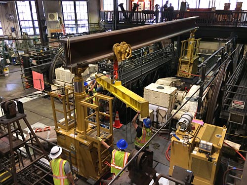 A custom rig with a massive I-beam and a beam trolley was required to safely lift the gearbox. The hydraulic gantry crane's I-beam is rigidly supported by a 100 ton capacity hydraulic ram on each end.
